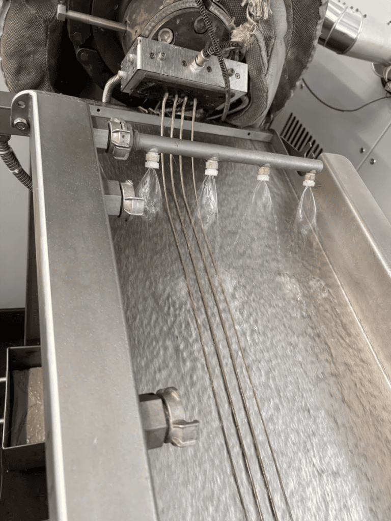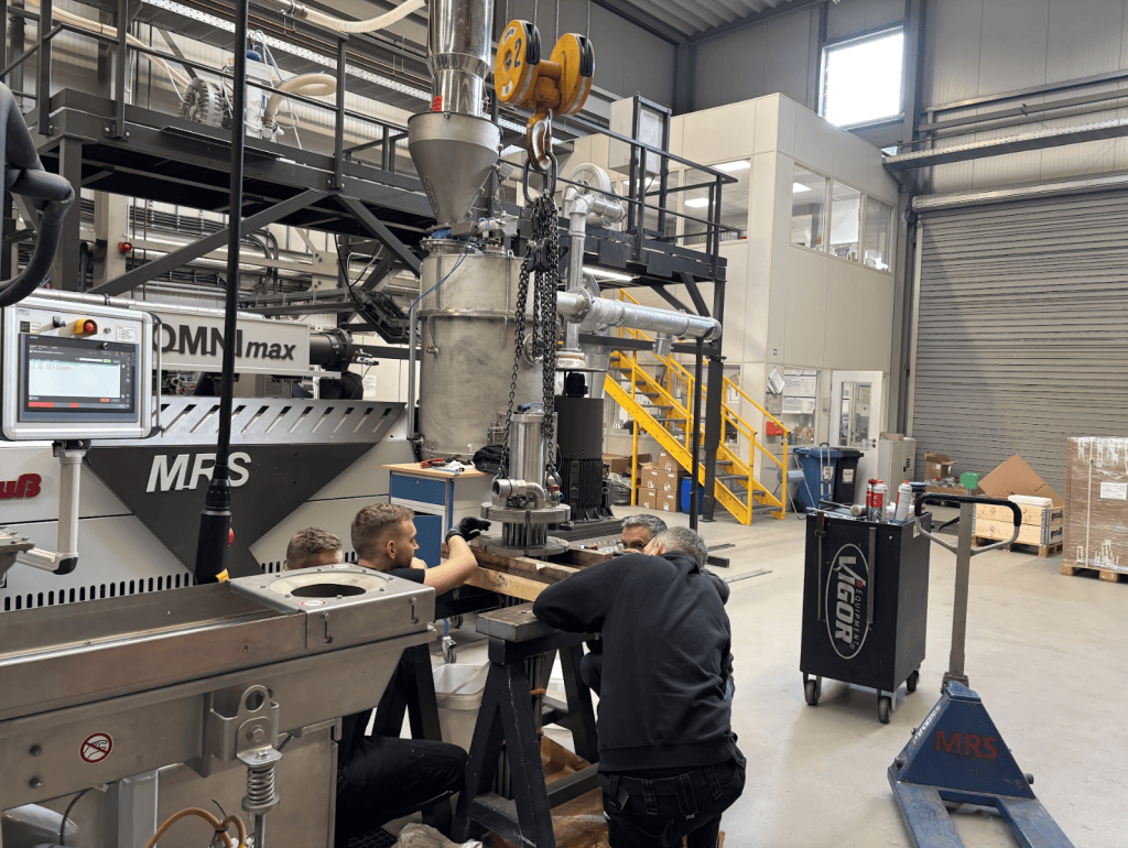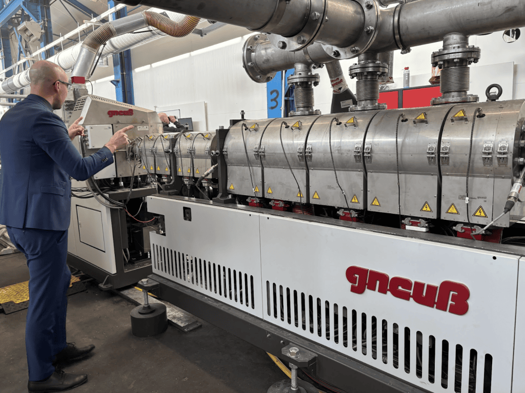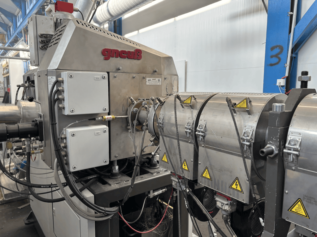 The purpose of the visit at Gneuss was to better understand whether post-industrial polyester cutting waste is suitable for thermo-mechanical recycling, a process that combines mechanical preparation with melting and regranulation to produce recycled polyester pellets.